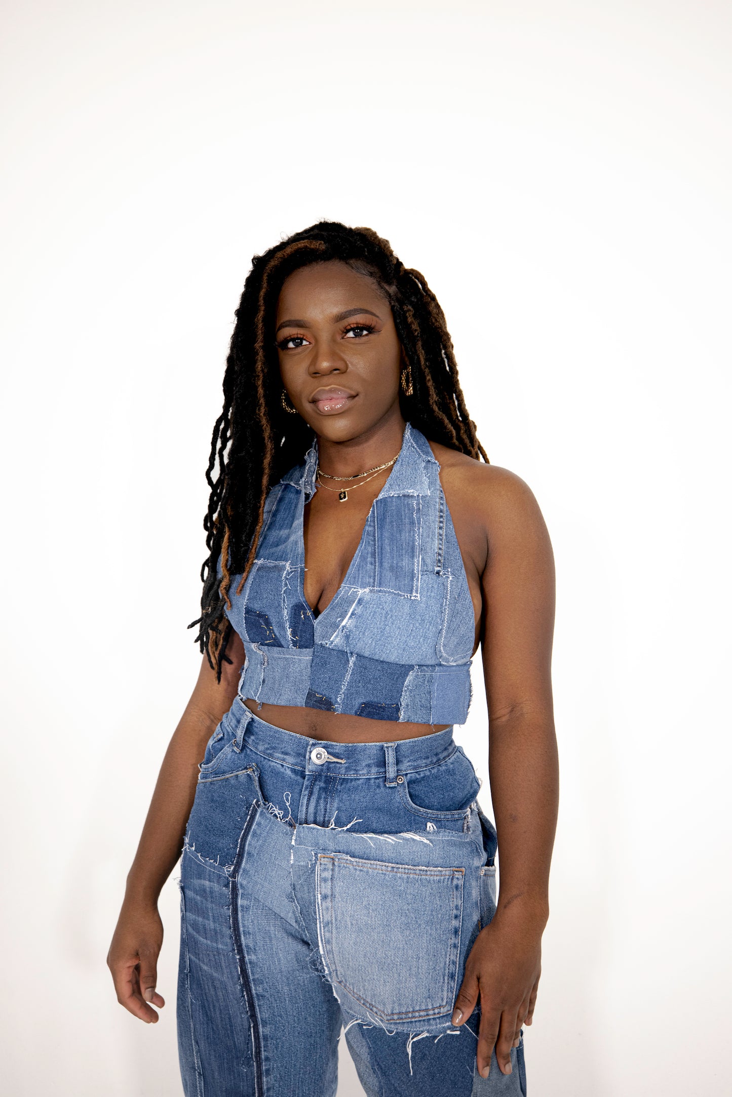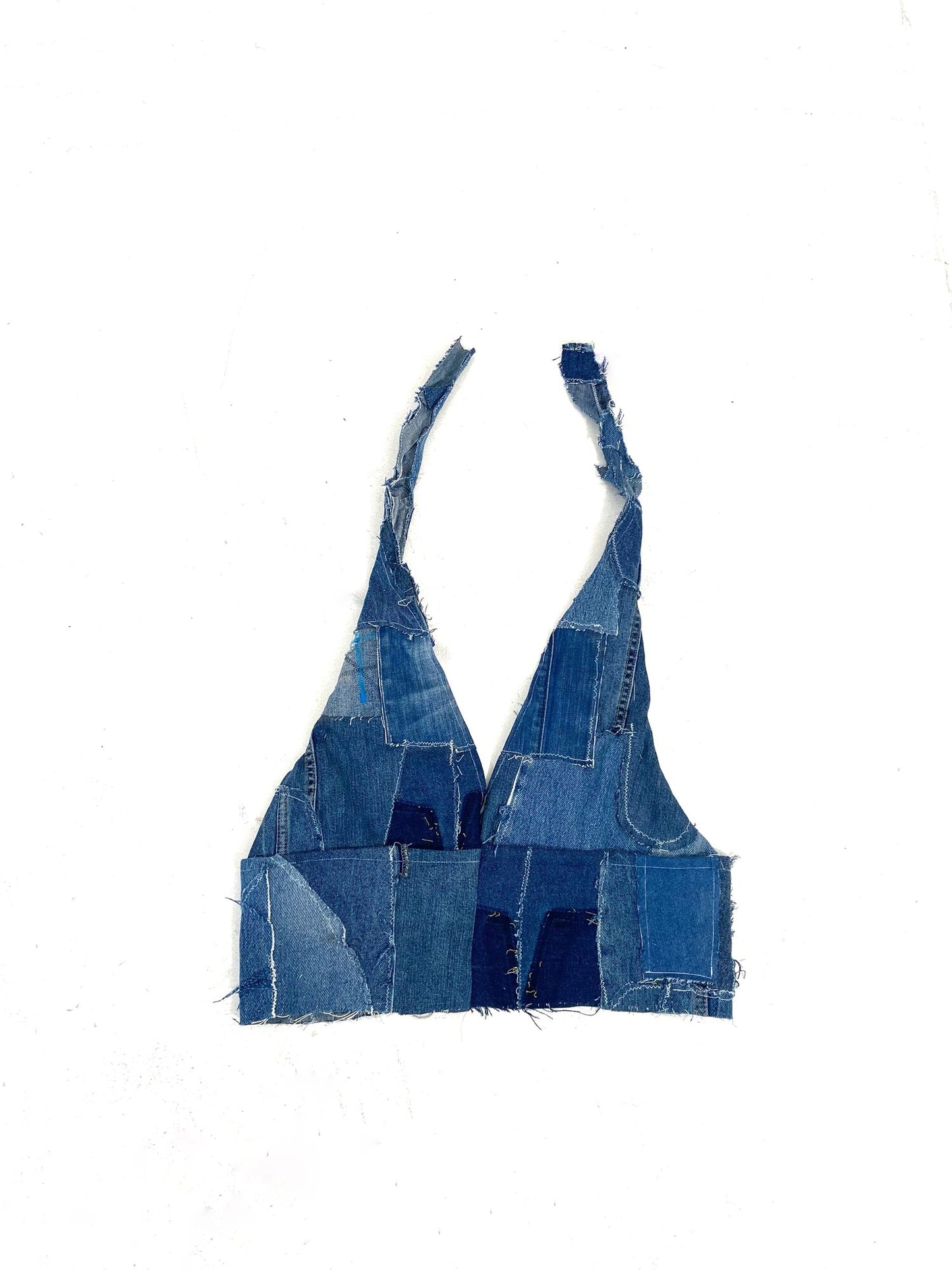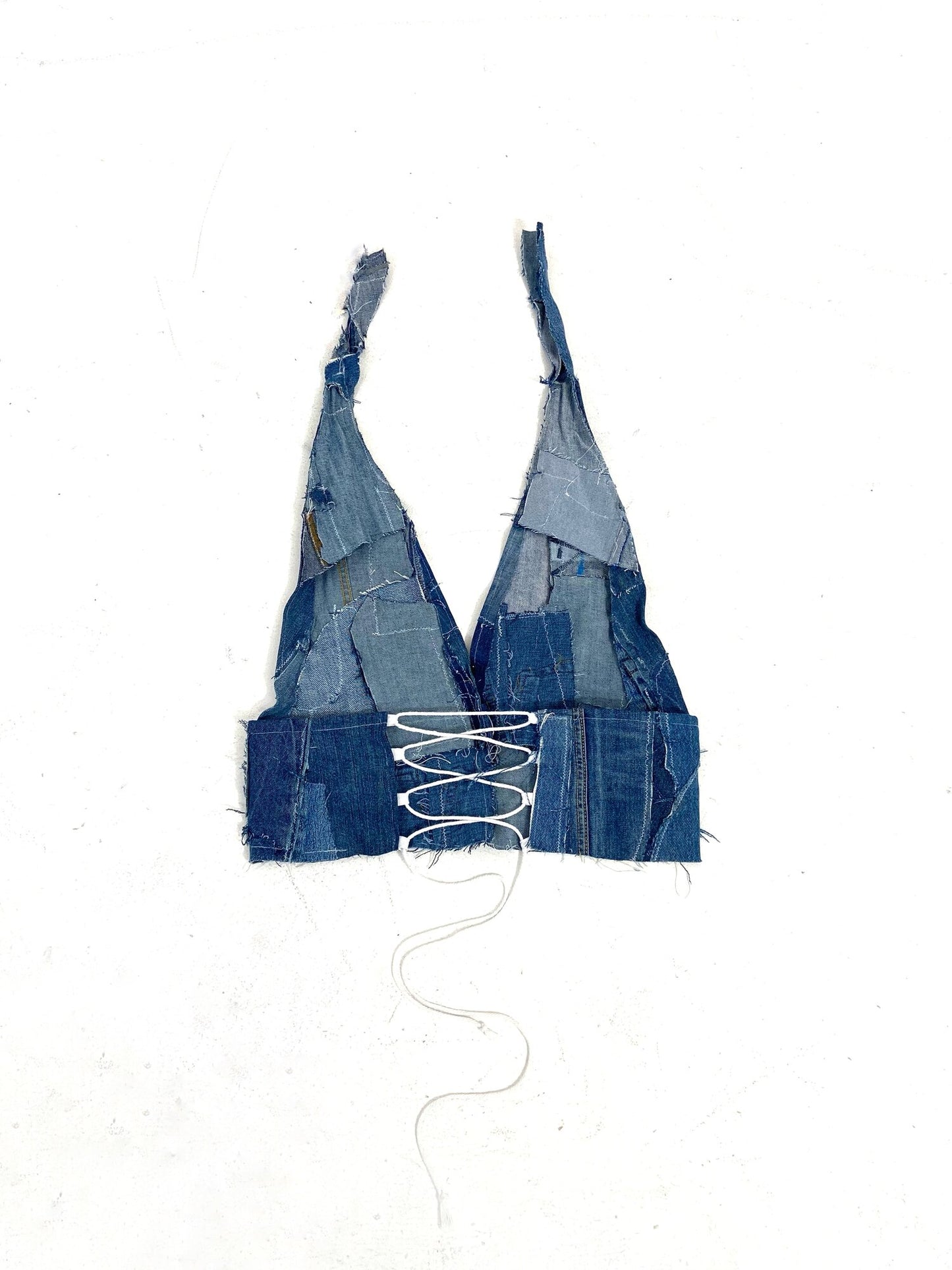 Revival’s handmade custom patchwork halter neck crop top is a one of one design made from denim leftover fabric from other designs. A true labour of love with each patch individually placed and stitched together. As this is a unique piece, the denim patchwork placement will vary. Lace up fastening on back to hug your figure. This item can be made to suit larger busts (please add bust measurement and bra size to your order notes).